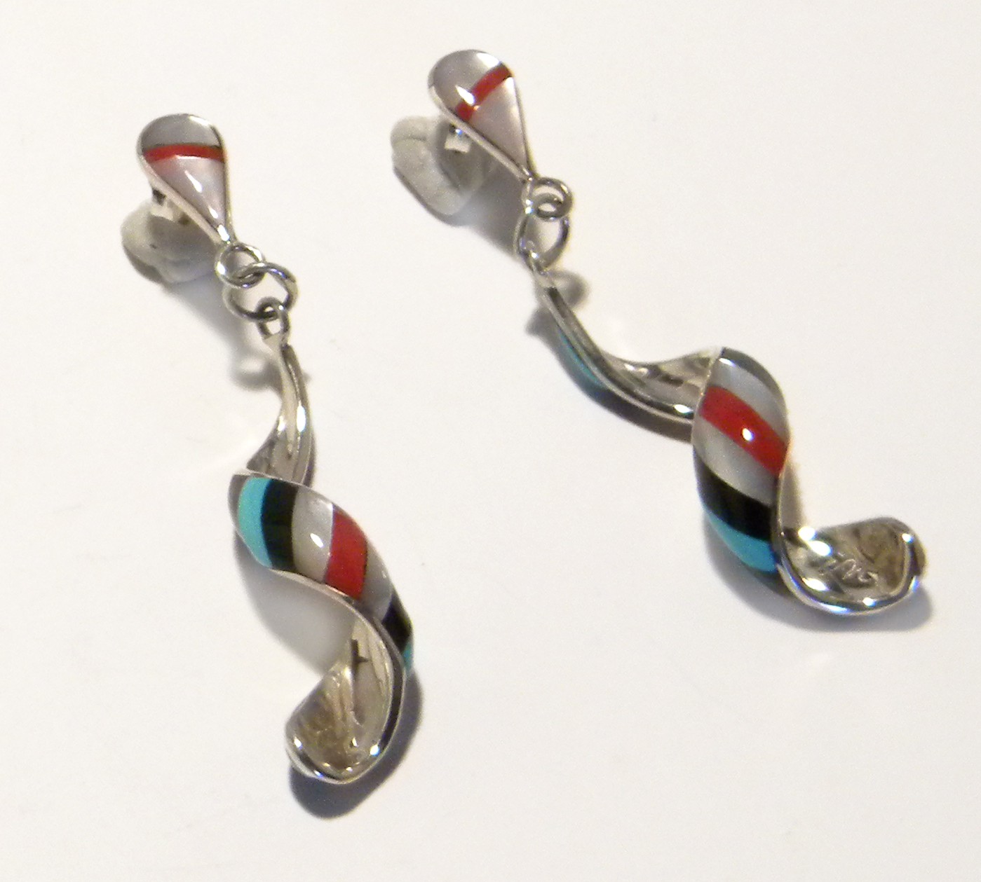 Orecchini a tortiglione in argento, corallo, jet, madreperla |